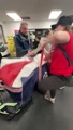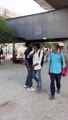Two men surprise strangers on the street by using a cloth rope to catch them off guard and push them in the opposite direction.