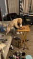 A small white dog is caught standing on a couch with it's front paws leaning on a tray table with a plate of food as it stick's it's snout into a glass of milk and laps up the liquid. When it sees the person approach it gets down onto the couch cushion and licks it's lips.