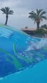 A man joyfully jumps around on an inflatable structure at a water park, having a blast. However, he suddenly loses his footing, slips, and hilariously slides all the way into the pool.