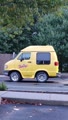 A very tiny yellow, retro style van is parked in a parking spot of a parking lot.